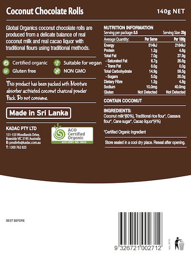 Global Organic coconut chocolate rolls are produced in Sri Lanka. This product has been packed with Moisture absorber activated coconut charcoal powder pack.